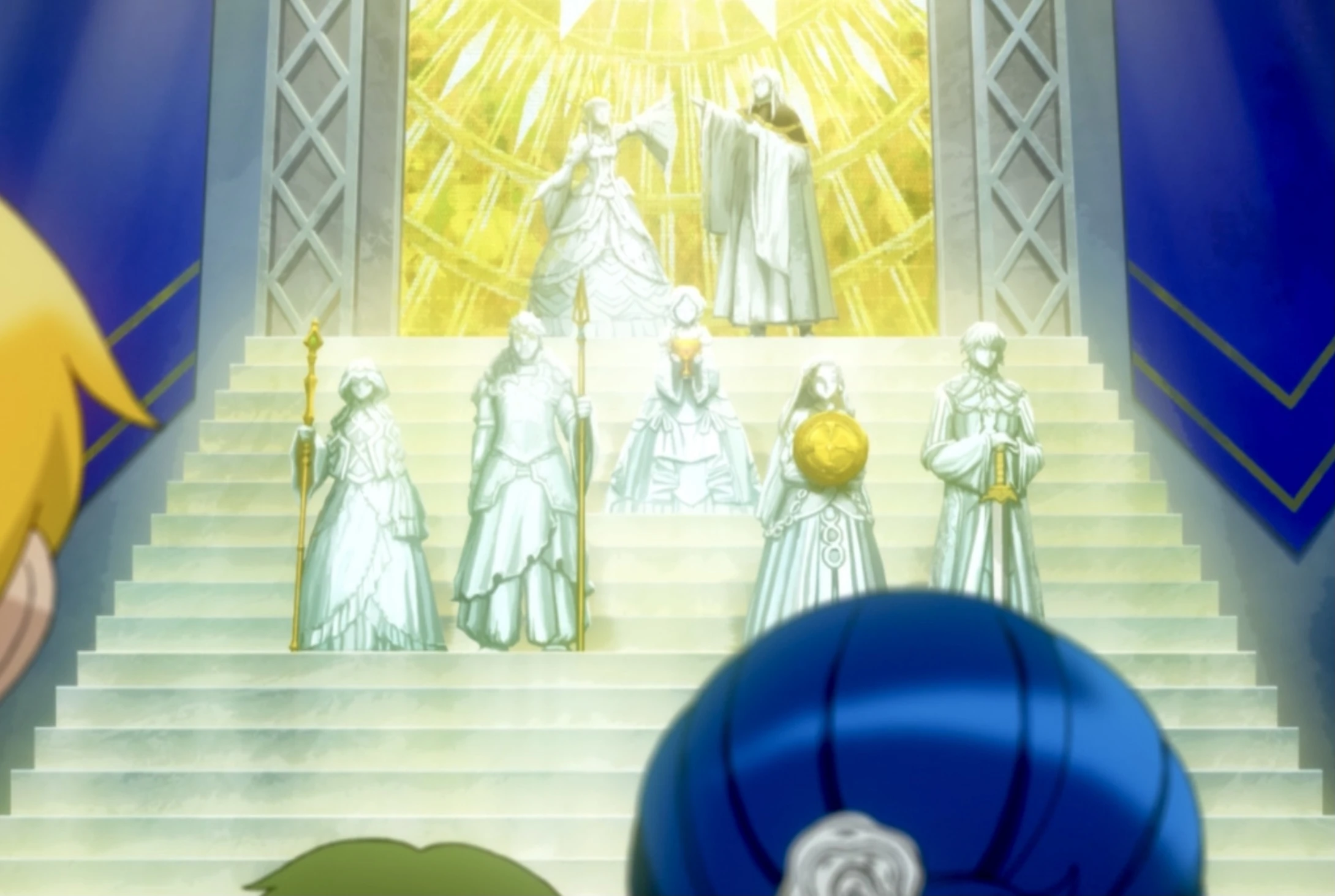When not in use for ceremonies, the Divine Instruments are held by statues of the respective god in the chapel in the duchies, or in the Sovereign Temple in the Sovereignty, while there still was one. After Zent Eglantine's reforms, they are presumably also held in the chapel in the Royal Academy in the Sovereignty. During ceremonies, they are put on top of an altar in accordance with the position of the gods. Since the God of Darkness and the Goddess of Light are the king and queen of the gods, their Divine Instruments are always up on the highest tier. Depending on the specific ritual in question, the second tier holds the Divine Instrument of the god associated with the ritual, with the other Divine Instruments of the Five being one tier lower still,[1] or all five remaining Divine Instruments are put on the second tier if it is a ceremony dedicated to all gods equally, like the Fealty Ceremony.[2]