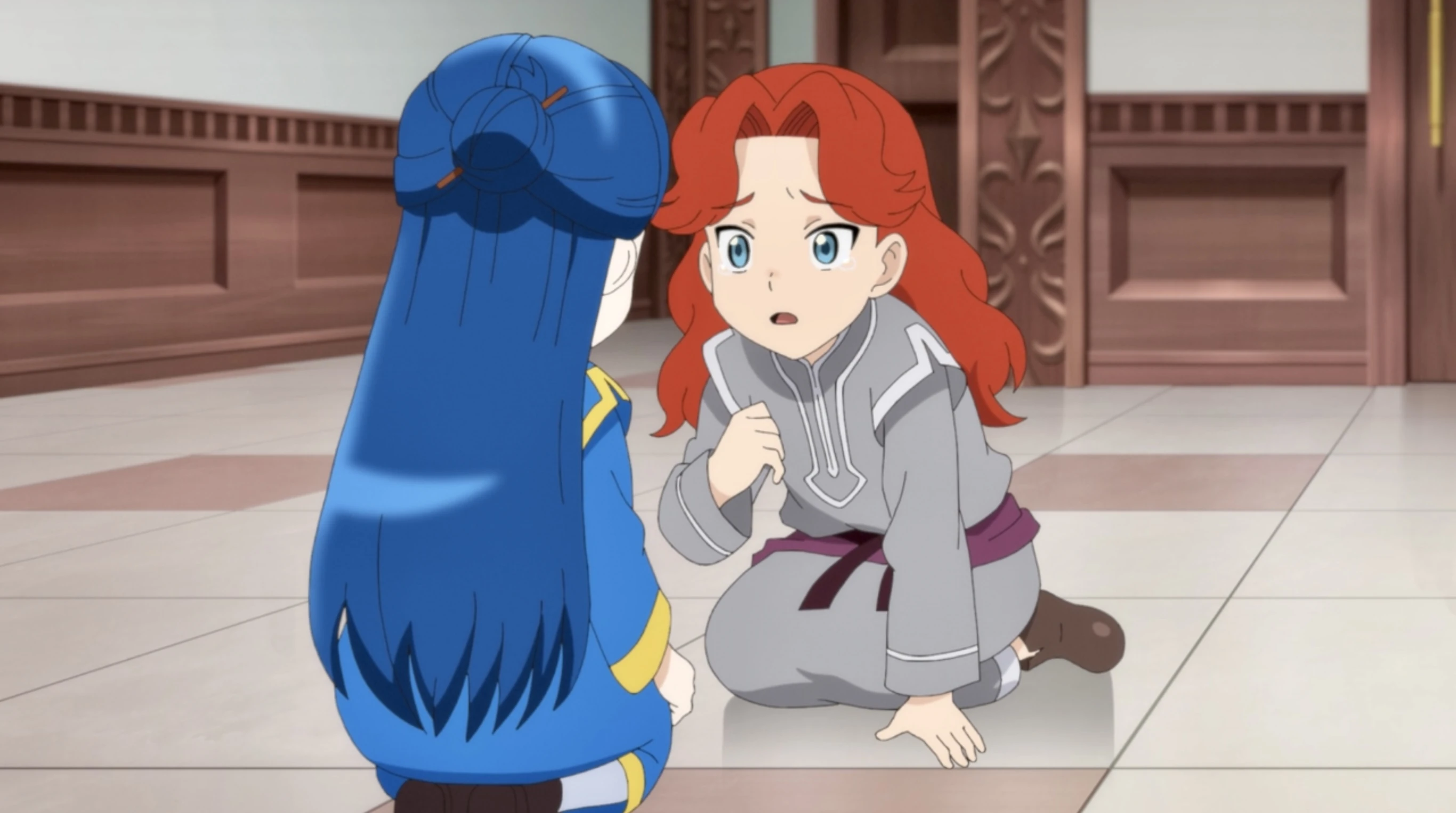 When Lutz drops off Myne at the cathedral gate, they are met by her three retainers. While Fran greets her warmly, Gil is still resentful of her and Delia runs off to the High Priest at her first opportunity. Angry at being ignored, Gil grabs Myne's shoulder and she falls over. In response, Lutz immediately tackles him and starts shouting at him.