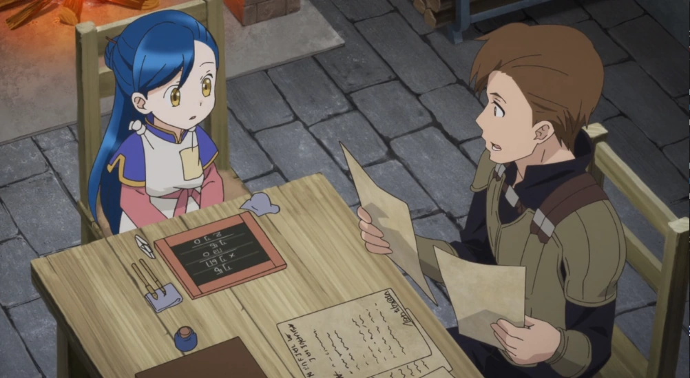 Myne runs out of pencils for her stone slate and asks to go back to visit Otto at the gate to get more. Jealous of her admiration for Otto, Gunther tells her that she can't go visit him until spring. However, he has no choice but to take her with him to the gate when both Tuuli and Effa leave to harvest parues the next day. While she practices the alphabet, she notices an error in Otto's accounting and corrects him. He asks her to help him with his paperwork, and she agrees in exchange for an unlimited supply of slate pencils and more reading lessons.