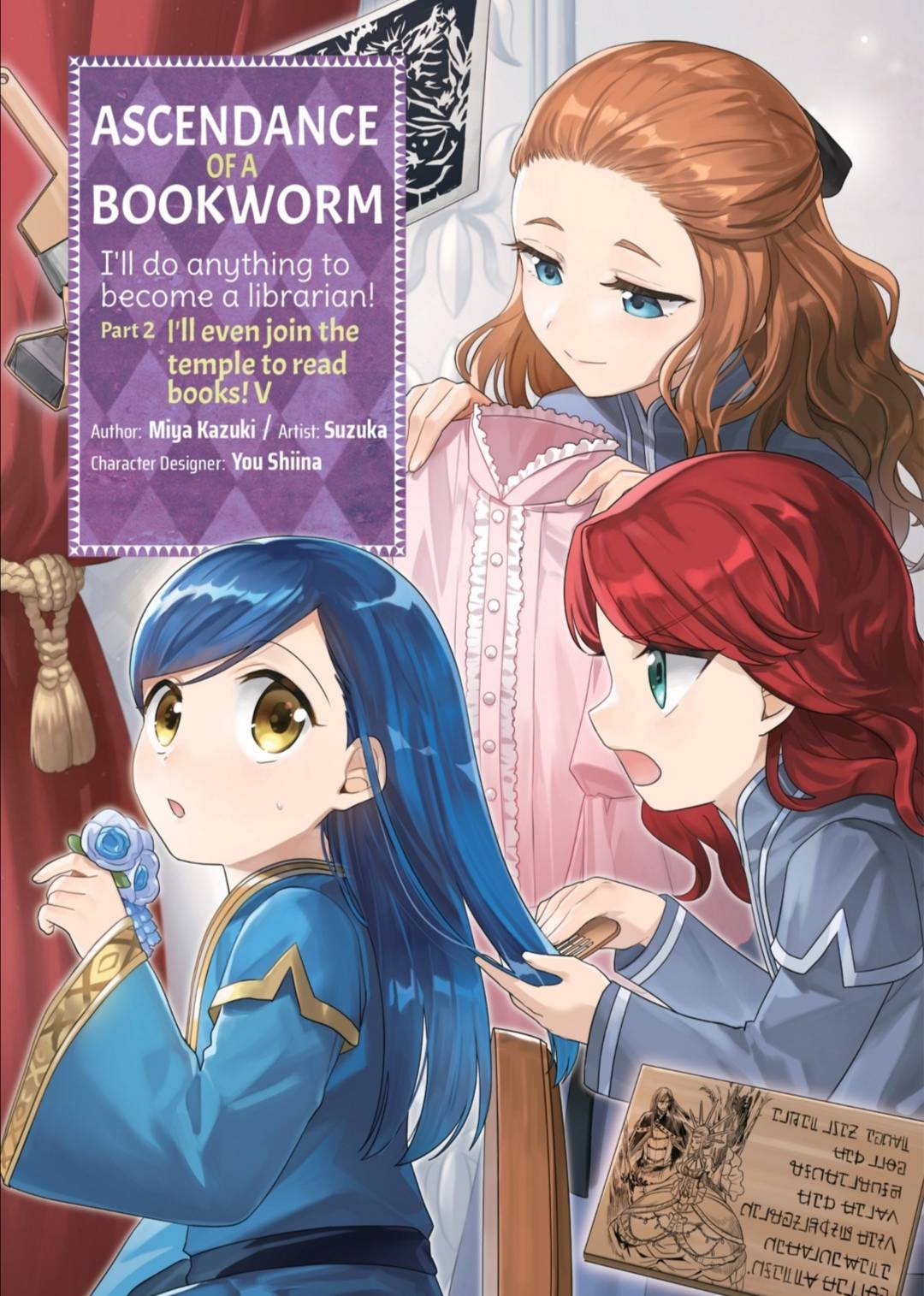 Ascendance of a Bookworm Part 2 Volume 5 (本好きの下剋上~司書になるためには手段を選んでいられません~ 第二部 「本のためなら巫女になる!5」 Honzuki no Gekokujou: Shisho ni Naru Tame ni wa Shudan wo Erandeiraremasen ~ Dai Ni Bu 「Hon no Tamenara Miko ni Naru! 5」) is the twelvth volume overall and fifth volume of Part 2 of Ascendance of a Bookworm manga, written by Miya Kazuki and illustrated by Suzuka.